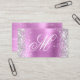 Créez votre propre parties scintillant en argent brillant et cartes de visite en feuille satinée lavande brillante. L'avant présente un chic monogramme de script de calligraphie blanche. Vous pouvez customiser la couleur et le style de police. Il y a de la place pour plus d'informations de contact sur le côté arrière. Un design féminin pour les wedding planners ou les techniciens de beauté. Tous les éléments graphiques et graphiques girly de ce design seront imprimés comme une photo numérique.