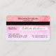 C'est le carte de visite parfait pour un technicien de clou tendance, élégant, girly et moderne. Ce design présente un design glamour et chic faux imprimé scintillant rose corail et rose rose pâle parties scintillant sombre dégradé avec un endroit pour ajouter votre logo d'entreprise dans le style mignon, unique et intelligent d'une carte de crédit. C'est le moyen idéal de promouvoir votre entreprise auprès de clients potentiels. ***REMARQUE IMPORTANTE DE CONCEPTION : Pour toute demande de conception personnalisée, comme les demandes de produit assorties, les changements de couleur, les changements de placement ou toute autre demande de modification, veuillez cliquer sur le bouton "CONTACTER" ou envoyer un courriel au concepteur directement à lafemme.art@gmail.com. Vous pouvez même lui envoyer par courriel une demande pour un design entièrement personnalisé et nouveau.