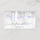 Carte de visite coiffeur élégant et joli avec parties scintillant faux argent, ciseaux holographiques, texture de marbre blanc et police de calligraphie élégante.