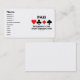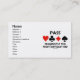 Si vous croyez que passer est souvent la meilleure enchère pour jouer au grand jeu de bridge, vous apprécierez de vous présenter avec n'importe lequel de ces cartes de visite qui présente les quatre costumes de carte avec le dicton "Pass - Frequently The Most Difficult Bid". Faites faire aux autres une double prise sur le jeu de pont à votre prochaine introduction! Un cadeau mémorable pour tout joueur de pont qui comprend combien il est difficile de passer à certains moments!