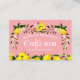 Joli et attrayant design citron. Convient à la couturière, tailleur ou fabricant d'artisanat. Convient à un usage personnel et professionnel. Vous pouvez modifier les textes en fonction de votre objectif. Sur l'avant, vous pouvez remplacer l'image centrale par votre logo. Et sur le dos, en plus d'ajouter votre adresse professionnelle, votre contact et votre heure, vous pouvez également changer l'image des citrons tranchés à votre logo/image/code QR.