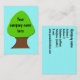 Ce carte de visite entièrement personnalisable dispose d'une image numérique amusante d'un arbre avec un haut vert et un tronc marron sur un arrière - plan bleu ciel. Vous pouvez taper le nom de votre société sur l'arborescence à l'avant, puis taper tous les autres détails importants au dos de la carte. Cliquez sur le bouton "customisez-le" pour affiner la taille, la police et l'emplacement du texte afin de répondre à vos exigences exactes. Ce carte de visite a été conçu pour les arboristes et les jardiniers, mais il convient aussi à d'autres types d'entreprises.