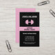 Un carte de visite graphiquement audacieux pour un entraîneur, un propriétaire de gymnase ou un entraîneur personnel avec un talent féminin. Une silhouette d'une haltère rose lumineuse se tient sur le fond noir riche de filet. Votre titre ou raison sociale se repose dans la barre rose saisissante dessous avec votre information de contact ci-dessous contre le noir riche. Ajoutez n'importe quelle information supplémentaire sur l'attention-obtention arrière. Disponible dans des couleurs alternatives avec les produits assortis.
