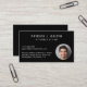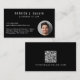 Carte de visite professionnel noir élégant avec votre photo de la tête prise dans un cadre circulaire et votre nom, titre et coordonnées (e.g., email, numéros de téléphone, nom de l'entreprise et adresse postale) en lettres blanches simples et modernes. À l'arrière, entrez une adresse URL pour créer un code QR numérisable lié à votre site Web, profils de médias sociaux ou autre plate-forme qui présente votre travail, ce qui permet aux autres d'explorer facilement votre expertise, et d'ajouter du texte ou de laisser vide.