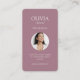 Carte de visite moderne et élégant avec un code QR pour les médias sociaux, photo, slogan, détails d'enquête et liens de médias sociaux. Les couleurs primaires utilisées en modèle sont le mauve et le blanc. Ce modèle tout-en-un polyvalent peut être mis à jour facilement. Remplacez la photo circulaire par la photo de profil ou le logo de l'entreprise. Votre image sera automatiquement ajustée pour s'adapter à une forme circulaire. Le design a un look et une atmosphère frais et chic.