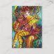 Couleur, fantaisie, peinture figurative contemporaine musicale aquarelle .Pierrot, un violoniste romantique au clair de lune avec chat et hibou en bleu, jaune, rose, sur le dos de la carte avec un rose doré rouge.Caractère du Carnaval de Venise.