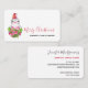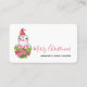 Un joyeux carte de visite de Noël au design mignon et fantaisiste avec un adorable pingouin portant un chapeau de santa rouge. Derrière un bouquet de fleurs aux sucres de canne rayés roses et blancs.