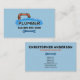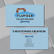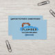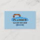 A plumber business card featuring a stream of water flowing from an orange pipe, and a wrench, all on a blue background.