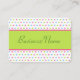 Des points de couleur clairs décorent ce carte de visite de style rétro. Customisez la carte pour répondre à vos besoins, ajouter ou supprimer des informations etc...Utilisez ces cartes de visite pour une entreprise, avocat, consultant, éducation, éducateur, golf, golf, golf, golf, golf, aménagement paysager, soin de pelouse, entrepreneur, programmeur, tuteur, musicien, artiste, peintre, styliste, garderie, préscolaire, fleuriste, boulangerie, designer, barbier, comptable, restaurant , boutique, etc...