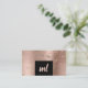 Les cartes de visite élégants présentent des points de confettis en faux or, la texture arrière - plan en or rose en cuivre, les initiales et les coordonnées.