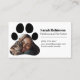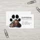 Un modèle de carte de visite minimaliste et moderne pour une chaise longue professionnelle. L'avant de la carte présente un grand empreinte de patte noir frappant qui encadre élégamment une photo personnalisable, vous permettant de montrer votre connexion avec les animaux. La disposition propre comprend de l'espace pour votre nom, titre et coordonnées. Le dos de la carte fournit une liste simple et claire de services, ce qui permet aux clients de comprendre exactement ce que vous offrez. Ce design est parfait pour tous ceux qui travaillent dans l'industrie de la garde d'animaux, des marcheurs de chiens et des gardiens de chiens aux toiletteurs d'animaux.