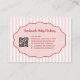 Trendy vintage-inspired pink red bow stripe pattern business card created for pretty, girly, feminine brands. Ideal for handmade baby clothing boutiques, makeup artists, and small business owners. Includes stylish QR code placement for modern networking and eye-catching professional branding.
