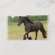 Cheval frison magnifique avançant à petit galop dans un domaine.