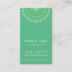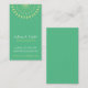 Un carte de visite simple, moderne et minimaliste avec une disposition verticale qui a un cercle de feuille comme la frontière décorative au dessus. Une palette de couleur verte avec quelques polices dans le blanc. Perfectionnez pour des dames qui est un instructeur de yoga ou de pilates ou dans l'industrie de méditation, de santé et de santé. Personnalisez avec vos détails d'affaires.