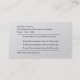 L'information sur l'inverse de la carte dans ce modèle inclut le nom, l'adresse et le numéro de téléphone de l'hôtel, l'appartement ou le logement auquel vous restent pour la durée de la mission. Y compris le nom et adresse est souvent utile comme rappel à vous-même et aux chauffeurs de taxi le témoin où vous restez si vous vous perdez, en plus des destinataires de information de lui, si sa connaissance est exigée.