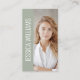 Make an instant, personal connection with this striking vertical business card design that dedicates most of the front to the individual's professional photograph. A chic, muted sage green vertical sidebar accents the photo and features the name in a modern, vertical orientation for a signature touch. The back uses the same stylish green and white color blocking, clearly presenting your logo, name, title, and all contact information, including a QR code for immediate digital networking.