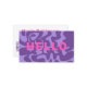 Bonjour dans une police en gras en rose chaud, sur une conception abstraite asymétrique en violet super, cette version a un code qr sur le dos.