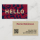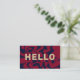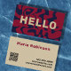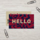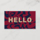 Bonjour dans une police audacieuse en beige neutre, sur une conception abstraite asymétrique en bleu marine et rouge bordeaux, cette version a un code qr sur le dos en noir.