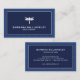 Une carte de visite classique et élégante avec une pointe de glamour - cette carte bleue et blanche pour agents immobiliers, designers d'intérieur, décorateurs et plus comprend un arrière - plan à motifs géométriques avec votre nom ou nom d'entreprise élégamment affiché dans une boîte encadrée avec un logo de libellule chic. © 1201AM Design Studio