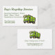 Un carte de visite en grève avec un camion à ordures en caricature verte. Ce grand carte de visite à thème de déchets fonctionnerait bien pour une entreprise de l'environnement de recyclage, de collecte de déchets ou de services de déchets. Facile à personnaliser avec vos propres informations d'entreprise.