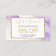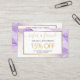 Cette carte de référence créative est composée d'un arrière - plan d'aquarelle lavande/violet doux avec de faux éclats de poussière d'or pour un design chic et abstrait. Encouragez la fidélité de vos clients en demandant à vos clients de recommander un ami en échange d'un rabais ou d'une promotion. Personnalisez le texte pour votre propre offre unique. Un design élégant créé pour les salons, les maquilleurs, les coiffeurs, les salons à ongles et plus encore. Art et design originaux © 1201AM Design Studio | www.1201am.com