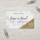Nous avons conçu cette carte de référence moderne et tendance. Notre design inclut "Référer un ami" dans un script de style brosse moderne en noir. Une arrière - plan en marbre blanc, moderne et tendance, ajoute une allure tendance et classe. Personnalisez avec vos coordonnées de référence, le nom de l'entreprise et les coordonnées. Notre carte de référence est parfaite pour un large éventail d'entreprises telles que salon de beauté, salon de clous, boutique, magasin de nuages, boulangerie, décoration maison, wedding planner, maquillage et bien plus encore !