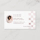 Turn heads with this chic light pink checkerboard design, featuring a stylish retro circle photo frame—perfect for showcasing your face or logo. Personalize with your name, professional title, and specialty to instantly convey your expertise. The reverse side mirrors the elegant checkerboard pattern and provides space for social media icons, contact details—making it easy for clients to reach you. Fully customizable to match your brand colors and style, this business card combines vintage charm with modern sophistication. Whether you’re an esthetician, skincare specialist, makeup artist, or beauty professional, this card is a standout way to present your brand with confidence and style. Design and layout by © Moodthology