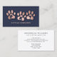 Services élégants de séjour pour animaux de compagnie carte de visite rose d'or et de marine avec empreinte de patte en couleur d'or rose sur un arrière - plan de la marine. personnalisez avec plus de détails sur le dos.