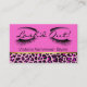 Carte de visite à la mode fait dans une rose indien, avec un accent repéré rose et noir de motif de jaguar, et graphiques des cils et des sourcils, sur l'avant supérieur. Le dos est fait dans le noir, avec la copie de jaguar, de l'aile gauche bordée avec de l'or. Le texte noir et rose, sur l'avant et le dos, est prêt à personnaliser à vos besoins. Beau tenez la carte qui emballe une première impression de stupéfaction.