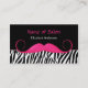 Écartez le mot au sujet de votre nouveau salon chic et élégant de salon de coiffure et de beauté avec ces cartes de visite roses et noirs élégants et à la mode de mode d'impression de zèbre avec une moustache girly de roses indien. Personnalisez en ajoutant le nom de l'esthéticien.