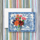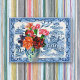 Des fleurs colorées dans un vase sont posées en face d'un plan de saule bleu traditionnel. Les motifs bleus du vase font écho aux couleurs et au style de la toile de fond d'inspiration asiatique. Les fleurs lumineuses ont un aspect contemporain même si elles ont été imprimées sur une carte de commerce victorienne antique. Cette belle image peut décorer les invitations, les annonces et l'intérieur de votre maison.