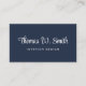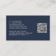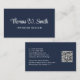 Carte de visite professionnel moderne bleu foncé avec votre nom monogrammed dans un script blanc élégant et audacieux et votre titre et informations de contact (tels que email, numéros de téléphone, nom de l'entreprise, adresse postale et identifiants d'utilisateur des médias sociaux) dans une typographie blanche simple et propre. Au verso, personnalisez avec vos coordonnées et ajoutez une adresse URL pour créer un code QR scannable connecté à votre site Web, portefeuille, profil de médias sociaux ou toute autre plate-forme qui présente votre travail, ce qui facilite l'exploration de votre expertise par les clients et les clients.