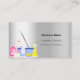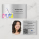 Un carte de visite élégant et glamour sur un arrière - plan faux argenté décoré d'équipements de nettoyage. Personnalisez et ajoutez votre photo, nom, informations de contact textuel et votre propre code QR à votre adresse de site Web.