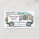 Cartes de visite de messagerie. Services de livraison Entreprise avec nom sur une Van d'entreprise. Image couleur d'un conducteur au volant d'une fourgonnette blanche. L'illustration apparaît de part et d'autre du carte de visite. Le livreur et la camionnette.