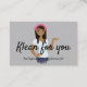Arrière - plan professionnel carte de visite gris clair avec l'image de la femme de ménage avec le ton de peau brun clair avec les cheveux brun et les yeux marron habillé en t-shirt blanc et jeans tenant des outils de nettoyage et des accessoires roses. Beaucoup d'espace pour modifier vos informations d'entreprise et écrire des slogans et plus encore. Faites votre propre carte de visite personnalisé.