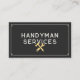 Un carte de visite en noir et gris clair avec l'illustration d'un marteau jaune et d'une clé. L'arrière - plan est composé d'un entourage de rue. Parfait pour toutes sortes d'activités de réparation, comme le bricoleur, les services de réparation de maison, la plomberie, etc.