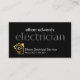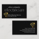 Une couverture entièrement noire est munie d'une signalétique translucide "électricien" près du centre de la carte. En haut se trouve votre nom prestigieux avec un logo de circuit d'ampoules d'or que vous pouvez utiliser à la base en plus du nom d'entreprise et des coordonnées. Au-dessus de la feuille, les détails de la carte sont sur la droite avec le logo or en haut. Il est suivi par votre nom prestigieux, les coordonnées et une option de slogan pour faire connaître vos services. C'est une carte créative à utiliser par les électriciens.