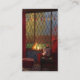 Un coin lecture confortable par jour pluvieux d'automne. Autour du foyer, un feu éclatant, des fauteuils rouges moelleux, des piles de livres, des teacakes et une théière complètent le confort. À l'extérieur, un saule jaune et une haie d'érable et de hêtre rouges sont obscurcis par la pluie qui s'enflamme, qui asperge la fenêtre où un chat gingembre s'assoit en regardant dehors.