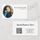 Ce design carte de visite est doté d'un espace réservé photo avec le nom et l'occupation du modèle. L'arrière comprend une conception et des couleurs coordonnées avec des champs de texte pour le nom commercial, les détails et le code qr. Remplacez la photo de l'espace réservé par votre photo au format vertical à l'avant et votre code QR à l'arrière. Remplissez les champs de personnalisation ou cliquez sur personnaliser pour sélectionner un style de police, une taille et une couleur que vous voulez.La photo de l'espace réservé est gracieusement offerte par pixabay.com.