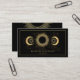 Un carte de visite instructeur de yoga éthérée céleste avec un mandala solaire en or moderne avec rayons solaires, et phases de la lune, avec un joli script moderne type signature. Effet de feuille d'or faux.