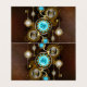 Turquoise lenses with antique watch with brass gears and golden keys on rusty, brown background. Steampunk style.