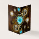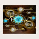 Turquoise lenses with antique watch with brass gears and golden keys on rusty, brown background. Steampunk style.