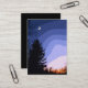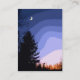 Cette carte de commerce d'artistes peint une image d'une planète paisible. Il fait crépuscule et tout est calme. Le ciel lumineux est une palette d'indigo, bleu, rose, jaune et rouge. Les pins sont encadrés par les couleurs du coucher de soleil. Un minuscule morceau de lune dans le ciel regarde vers le bas sur la scène.