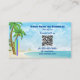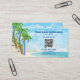 Ce carte de visite de code QR dispose d'une planche de surf sur une plage tropicale plantée de palmiers. L'eau est d'un beau bleu et il y a des nuages éparpillés dans le ciel. - par The Beach Bum
