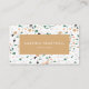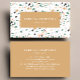 A modern business card design featuring a trendy terrazzo pattern in shades of green, tan, gray, coral and black on a white background. Personalize it with your name and title in white text on tan rectangle. Add your name, title and contact details on the reverse side.