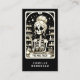 A unique nail technician business card featuring a skeleton with tools of the nail technician. A unique style with a touch of humor. Sepia and white on black.