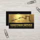 Une couche de colonne dorée et noire est accentuée par un motif créatif d'outils handyman en or avec un design sur le toit à l'arrière - plan. La couche noire abrite le nom d'entreprise surdimensionné "HANDYMAN SERVICE" et le type de service offert juste en dessous. ; Veuillez modifier la liste de services pour qu'elle corresponde à vos besoins de service. Sur la feuille, dans une couverture noire, un logo doré domiciliaire que vous pouvez utiliser est en haut. Ceci est suivi par votre nom, les coordonnées et une option de slogan pour faire connaître vos services. Toutes les lettres sont en faux or. Une grande carte professionnelle pour la construction et les thèmes handyman. #handyman #construction #chantier de construction #chantier de construction #homerepair #entrepreneur