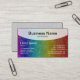 Modèle de carte de visite avec une zone d'en-tête incurvée semi-transparente pour le nom de l'entreprise et le type d'entreprise, etc, avec le nom, le titre de l'emploi et d'autres coordonnées dans la section ci-dessous. La face arrière de la carte est laissée en blanc bien que la couleur de base soit dérivée à l'aide d'une image blanche semi-transparente, de sorte qu'elle correspond à l'en-tête semi-transparent sur le devant. Il peut être laissé en blanc, ce qui est utile pour écrire des notes ou peut être customisé et/ou utilisé pour des textes/graphiques supplémentaires. Cette version a également une texture blanche semi-transparente sur le devant et le dos et une image arc-en-ciel semi-transparente sur le devant qui crée la variation de couleur arc-en-ciel foncé.