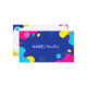 A modern and colorful business card featuring abstract shapes in blue, pink, yellow, and turquoise on a dark blue background, with space for a name/handler.