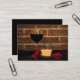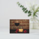 Cette carte d'artiste présente une image simple d'un verre de vin, une assiette de fromage et trois fleurs rouges contre un mur de briques rouges rustique.